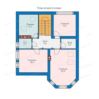- Второй этаж – спальня на 23,7 м2, два санузла по 7,8 м2, холл – 7,1. Две другие спальни – 25,1 и 16 м2, у большей из них имеется выход на балкон площадью в 4,2 м2 квадратной формы на плане.