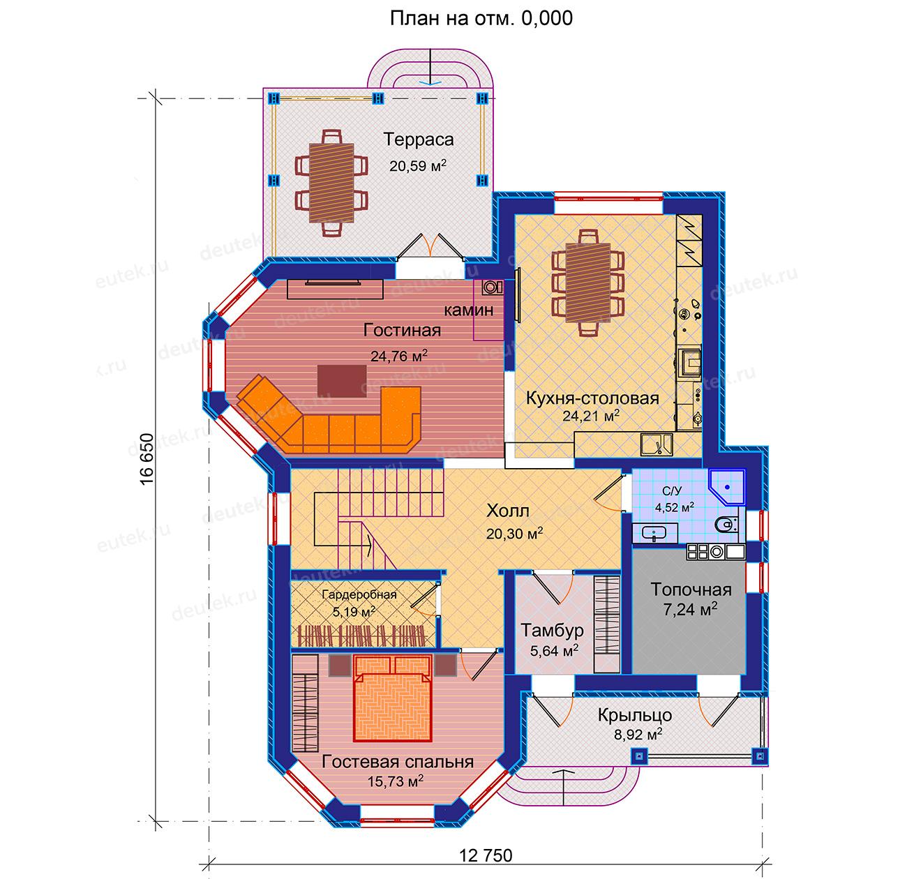 Круглые и полукруглые комнаты – крайне непрактичная схема, требующая большей площади, которую займёт дом в итоге. На практике всё-таки распространены дома с квадратной или прямоугольной террасой и верандой, причём она может выходить за пределы общего периметра дома, будучи пристроенной снаружи. Так, один из типовых проектов дома имеет следующие помещения: