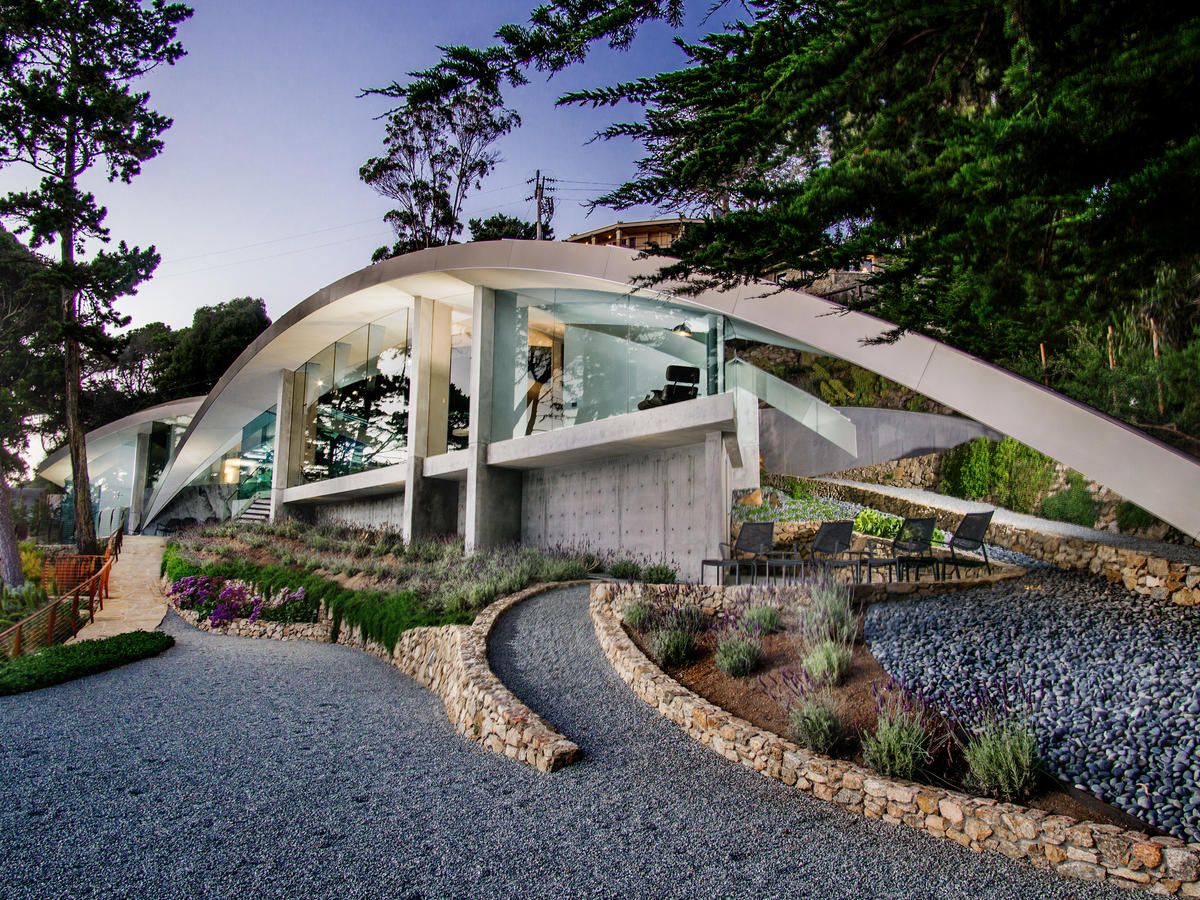 - Проект современного трехэтажного бетонного дома Cresta площадью 492 м², созданный инженерами студии Jonathan Segal. Строение расположено в Ла-Хойе, Калифорния. Цокольный этаж размещен под землей. На втором и третьем этажах обустроены стеклянные фасады и открытые площадки.