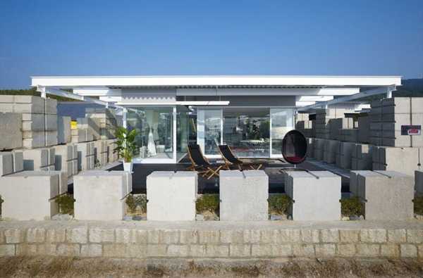 Фасад особняка стеклянный, то есть первый и второй этажи полностью открыты для проникновения солнечных лучей, что создаёт лёгкость бетонной структуры. Боковые части стены и крыша состоят из теплобетона. На верхнем уровне есть открытая терраса, которая огорожена металлическими перилами.
