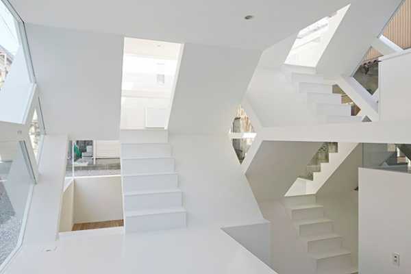 Жилые комнаты тут находятся на первом этаже, в подвале – подсобные. У северной стороны постройки можно увидеть вместительный двойной гараж, вход куда есть также из подвала. Внутрь дома ведет лестница из общей гостиной. Дабы придать дополнительного объёма пространству, архитекторы сделали так, что белый цвет помещений играет разнообразными оттенками в дневное и ночное время. Создается ощущение более оживленного, подвижного здания, а естественное освещение слегка смягчает внутреннюю эстетику в белых тонах.