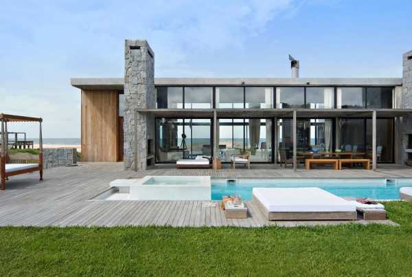 Особняк включает в себя такие противоречивые компоненты, как современная функциональность и применение натуральных материалов, застеклённые фасады и единение с природой.