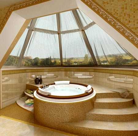 - Ванная комната. Это очень смелое решение, но оно того стоит. И вы это оцените сполна, когда будете принимать пенную ванну, одновременно любуясь яркими красками заката или рассвета, наслаждаться пением птиц и шумом листвы за окнами.
