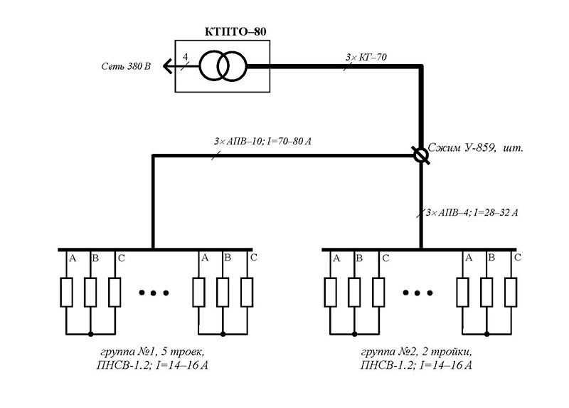 11 и ГОСТ 12.1.013-7 — в данном случае задействован понижающий трансформатор КТПТО-80, как на фото вверху.
