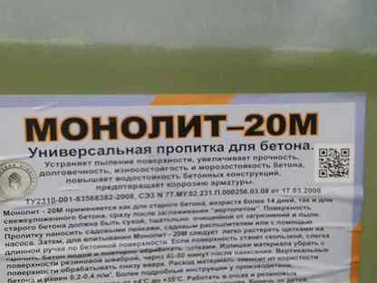 Пропитка для бетона «Монолит-20М» применяется для старого бетона. Бетона более 14 дней после укладки (и возраста нескольких десятков лет).