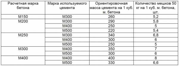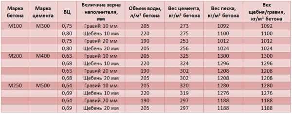 С учётом рекомендованных выше соотношений данные по необходимым пропорциям и количеству компонентов в расчёте на 1 м3 бетонной смеси сведены в таблицу: