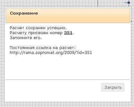 Убедитесь, посмотрите сохраненный расчет http://rama.sopromat.org/2009/?id=351 Загрузка расчетаК сохраненной схеме можно перейти, например, по полученной при сохранении ссылки. (пример http://rama.sopromat.org/2009/?id=351) Или, зная номер сохраненного расчета, выполнить «Загрузку расчета».