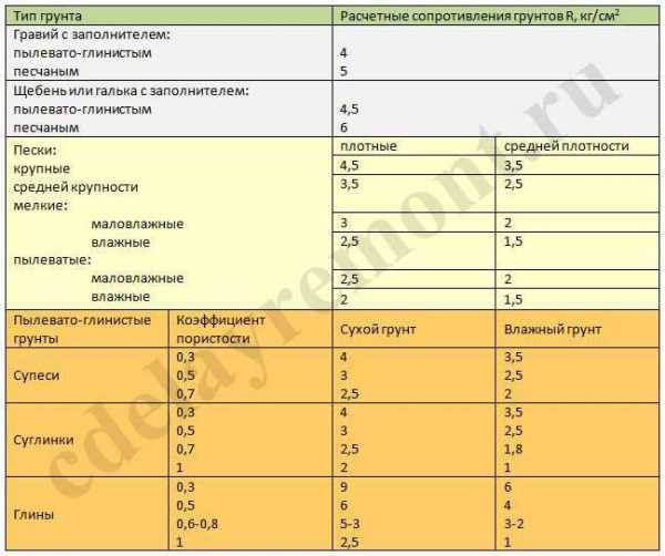 Если планируется заглублять фундамент на меньшую глубину, то придется дополнительно рассчитать сопротивление грунта по формуле, представленной здесь.
