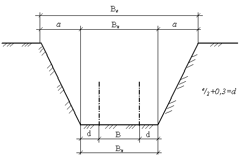 Vт = (B1 + B2) / 2 x L x H, где B1 – является шириной верхнего среза рва, B2 – ширина дна, L – длина канавы, H – глубина.
