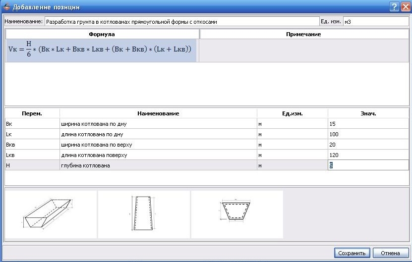 Vк = H/6 x{Bк Lк + Bкв Lкв + (Bкв + Bк)x(Lк +Lкв)}, где Bк и Lк – является шириной и длиной дна, Bкв и Lкв – шириной и длиной верхнего среза, H — глубиной котлована.