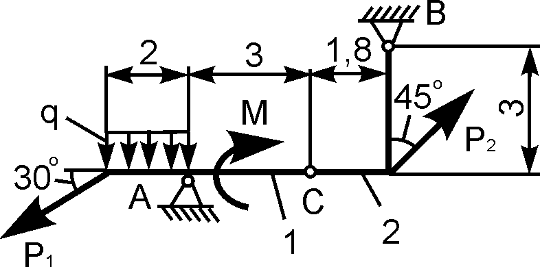 Плоская статически определимая конструкция состоит из двух частей АС и ВС, соединенных шарнирно в узле С (см. рисунок 1).