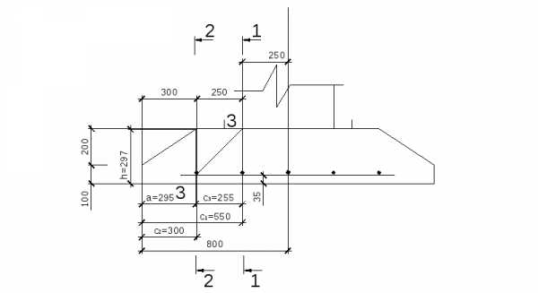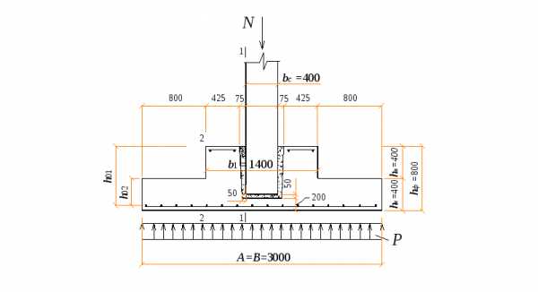 Рабочая высота сечения составляет h0=h—a (a принимается 0,05 м, где а — расстояние от середины сечения продольной рабочей арматуры до нижней грани поперечного сечения фундамента).