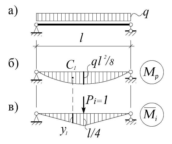 а) конструктивная схема простой балки; б), в) расчетные схемы