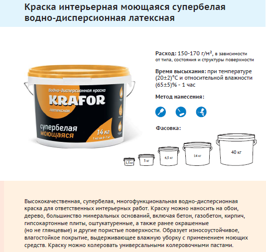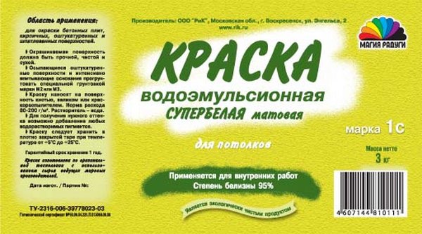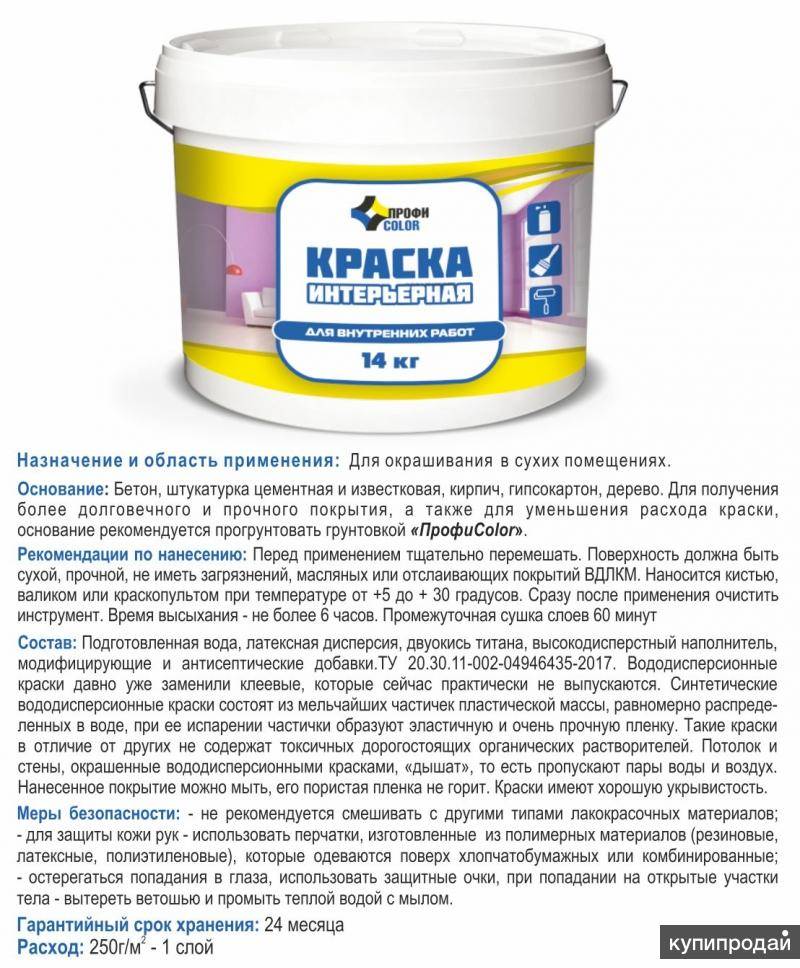 В состав входит клей ПВА, что обеспечивает относительно невысокую цену, но делает краску непригодной для использования в условиях повышенной влажности.Для первого слоя вам понадобится 5,5 кг этого вида краски на 10 м², а для второго слоя – 3,5 кг.