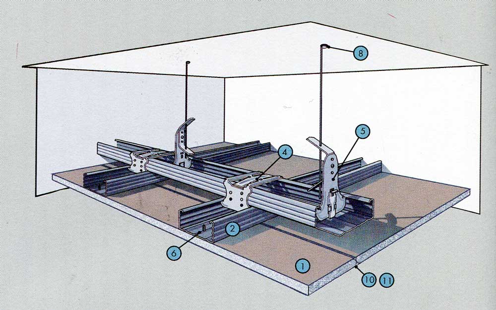 Собирается потолочная система из профилей и подвесов, закрепленных на плите перекрытия. Профили образуют решетку, в ниши которой вставляют плиты. Общий вес системы небольшой, она не создает существенной нагрузки на несущие конструкции.