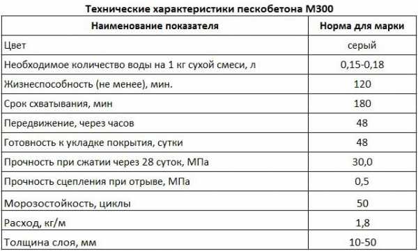 Расход пескобетона в большей степени определяется его техническими характеристиками, а те, в свою очередь, зависят от количества измельченного цементного клинкера. Описываемый материал (М300) представляет мелкозернистый бетон, который отличается высокой сопротивляемостью растяжению. Усадка не является для него характерной, но он может похвастаться своей прочностью, устойчивостью к коррозии, температурным перепадам, влаге, огню.