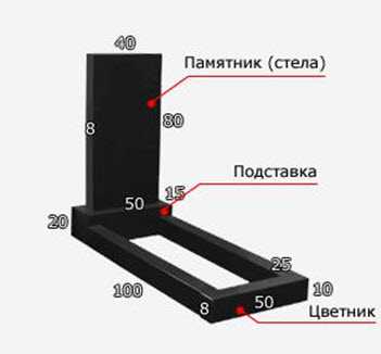 Стандартные размеры надгробий находятся в зависимости от формата всех их составляющих. Как правило, на могилу устанавливают комплект, который состоит из стелы, тумбы и цветника. Так, говоря о габаритах памятника, стоит учитывать размеры двух элементов – стелы и постамента — их совокупность определяет окончательную высоту изделия.