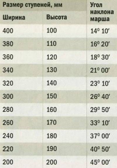 Делается упор на максимальную и минимальную высоту и глубину ступени. Исходя из данных параметров, базируясь на размерах проступи и подступенка, можно отметить, что угол наклона колеблется в интервале от 33 до 45 градусов. Когда дело касается внутренних лестниц, то данное значение должно быть до 38 градусов. Когда речь идет о подсобных либо чердачных лестницах, которые характеризуются более крутым спуском, оптимальный угол наклона равен до 45 градусов.