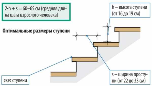 - Если сложить размеры двух подступенков и одной проступи, то это значение должно соответствовать среднему значению шага, равному 60-65 см.