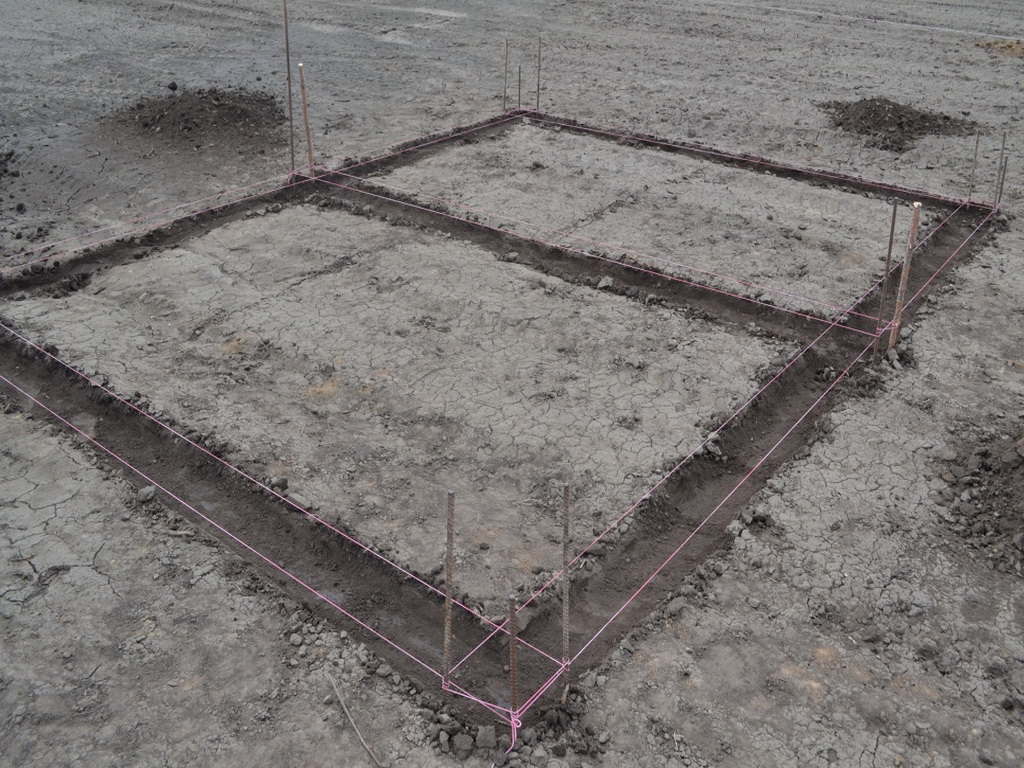 Начинается работа по выкапыванию котлована, для чего в каждом из углов устанавливаются колья, являющиеся ориентиром. Используя колья, натягивают шпагат вдоль всего периметра будущего здания. После этого надо выяснить, каковым является горизонтальный уровень каждой из стен, для чего пользуются специализированными приспособлениями: