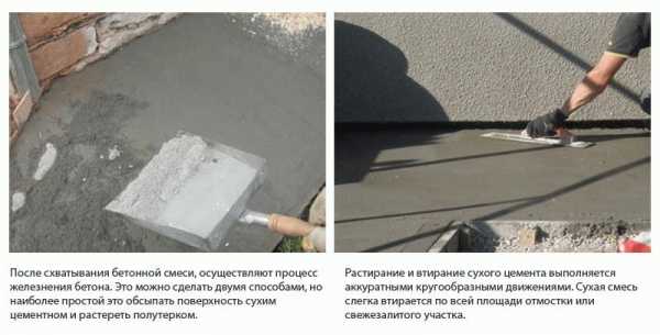 - Пока раствор не застыл, сделайте железнение его поверхности, посыпав цементом и пригладив мастерком. Так можно снизить пористость готовой поверхности.