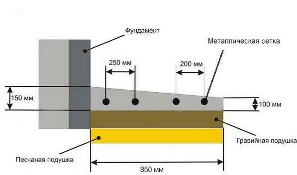 Схема устройства отмостки с размерами.
