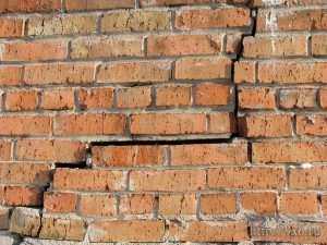 Фундамент из красного кирпича сильно пострадал в результате просадки дома- Начинаем с осмотра. Находим все трещины основания – рекомендуется частично снять вокруг них отделу, чтобы точно проверить степень повреждения.
