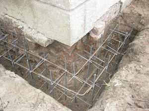 Под новый фундамент делают опалубку с арматурным каркасом внутри и заливают её бетоном
