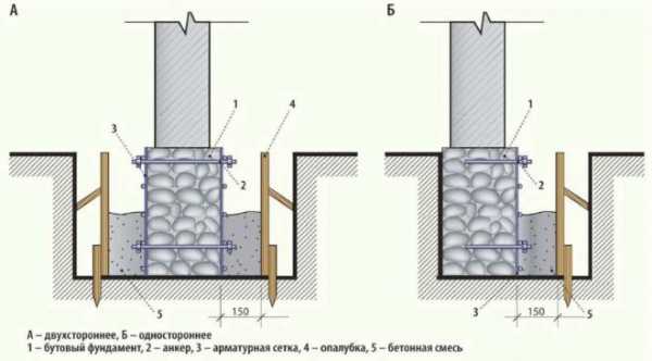 Чтобы на месте кирпичного или бутового основания возвести бетонный фундамент, выполняют следующие действия: