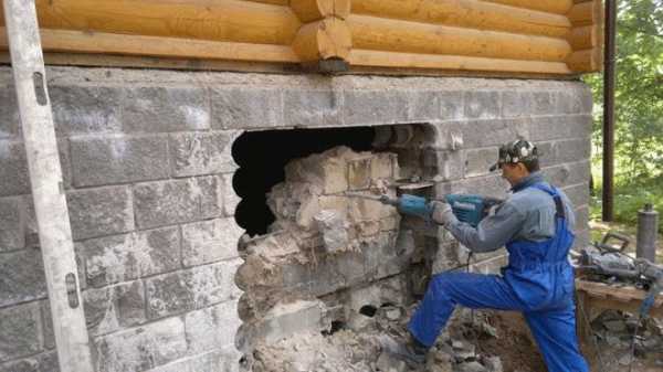 - Старую кладку из кирпичей или бутовых камней разбирают по частям. Удаляя каждые полметра конструкции, сначала устанавливают домкрат, а позже — металлические опоры, берущие на себя вес постройки.
