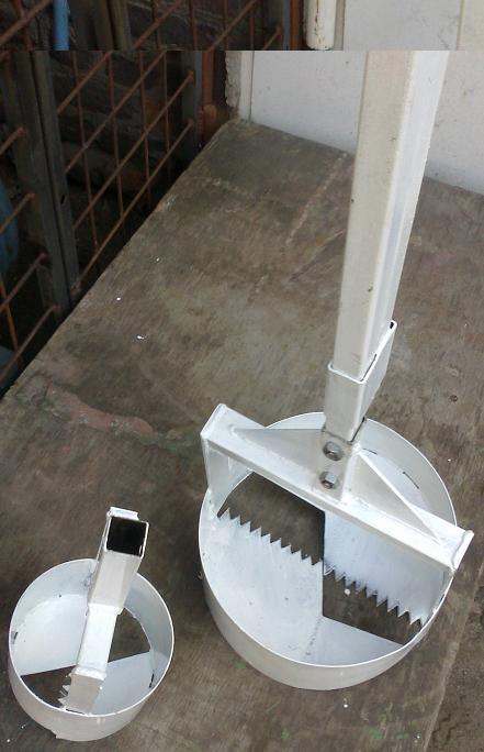 В качестве ножа тут выступает обрезанная лопата, а землеприемник сделан из банки из-под сельди. Нож закреплен подвижно, при опускании в шурф подтягивается привязанным к концу капроновым тросом. Достигнув дна, трос ослабляют, лопатка начинает подрезать бока шурфа, формируя необходимое расширение.