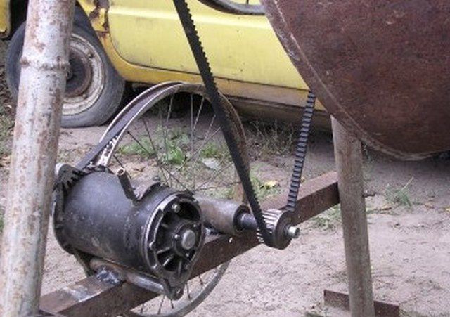 Самодельная бетономешалка из бочки, запчастей от машины, велосипеда, бензопилы и стиральной машинкиСамодельная бетономешалка из бочки, запчастей от машины, велосипеда, бензопилы и стиральной машинкиНа ось через переходную втулку одет большой шкив и прихвачен в двух местах сваркой.