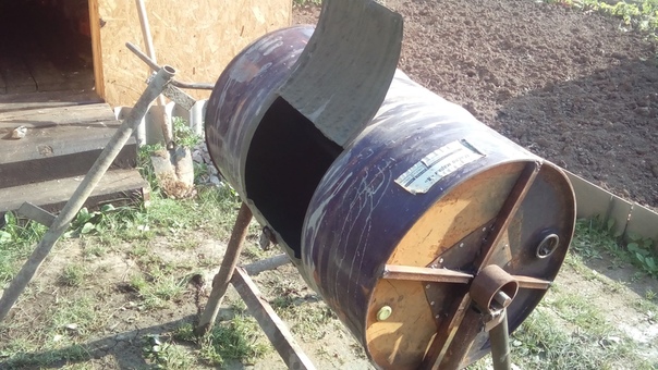 Самодельная бетономешалка из бочки, запчастей от машины, велосипеда, бензопилы и стиральной машинкиВ основе всей конструкции лежит 100 литровая толстостенная бочка, у которой срезана одна сторона.