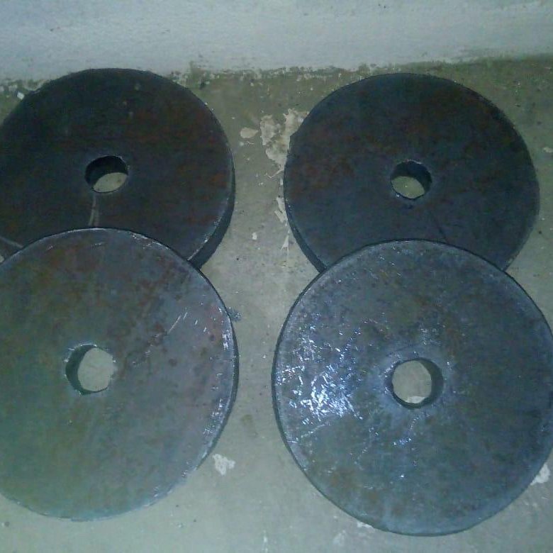 - Блины вырезают автогеном из листовой стали. Вес одного диска с диаметром 18 см и толщиной 1 см составляет 2 кг. Это позволяет с легкостью рассчитать требуемое количество блинов, чтобы получить массу в 10, 20, 30, 40 кг.
