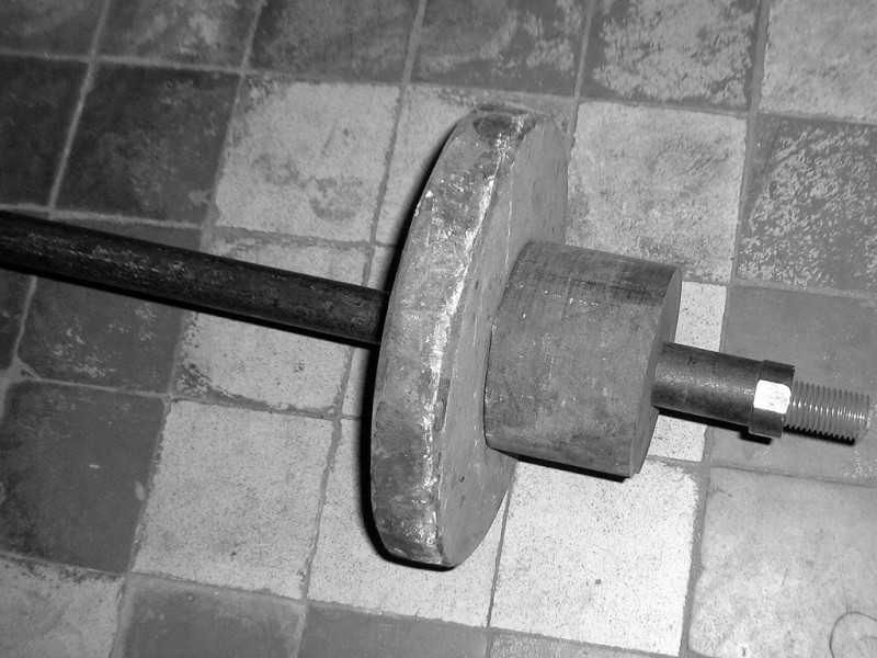 - При изготовлении штанги из использованных маховиков в качестве грифа используют арматуру подходящего диаметра с нарезанными с обеих сторон резьбами. Для предотвращения проскальзывания рук на арматуру можно натянуть резиновый шланг. Поскольку накручивать его на гриф насухо довольно трудно, можно смазать арматуру масло и процесс пойдет быстрее. На оба конца штанги накручиваются гайки с тем расчетом, чтобы осталось место для блинов-маховиков. Для их фиксации также используют гайки или же делают специальный стопор.