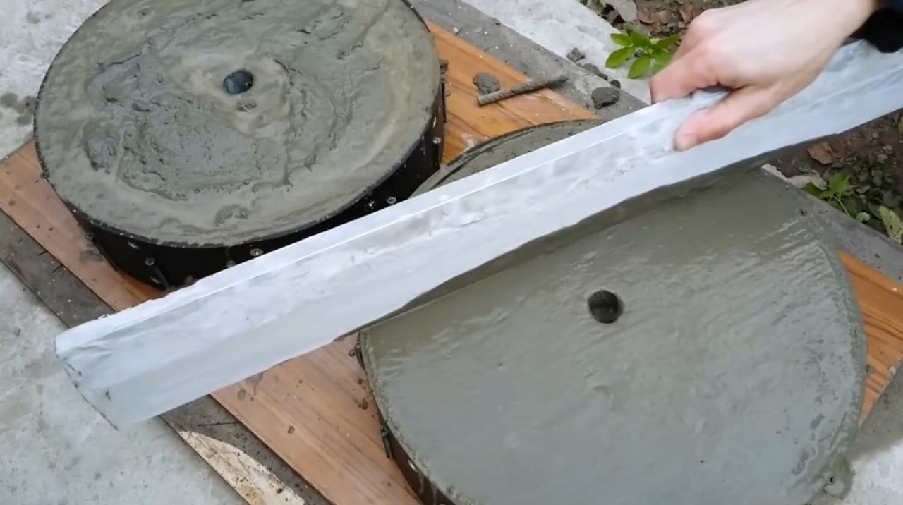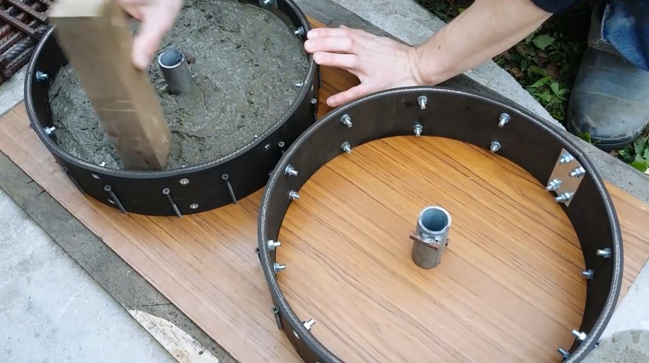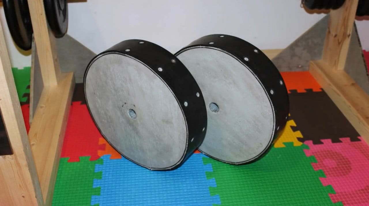 В имеющихся «дисках» высверливаются отверстия, в которые вставляются небольшие металлические прутья или толстые гвозди. Они необходимы для фиксации заливаемого слоя бетона. Остальной процесс производится по тому же принципу, что и в первый раз. Главное — не переусердствовать, ведь полученный вес может быть в несколько раз тяжелее. В заключение остается пожелать вам удачного «кача» и крепких стальных мышц.