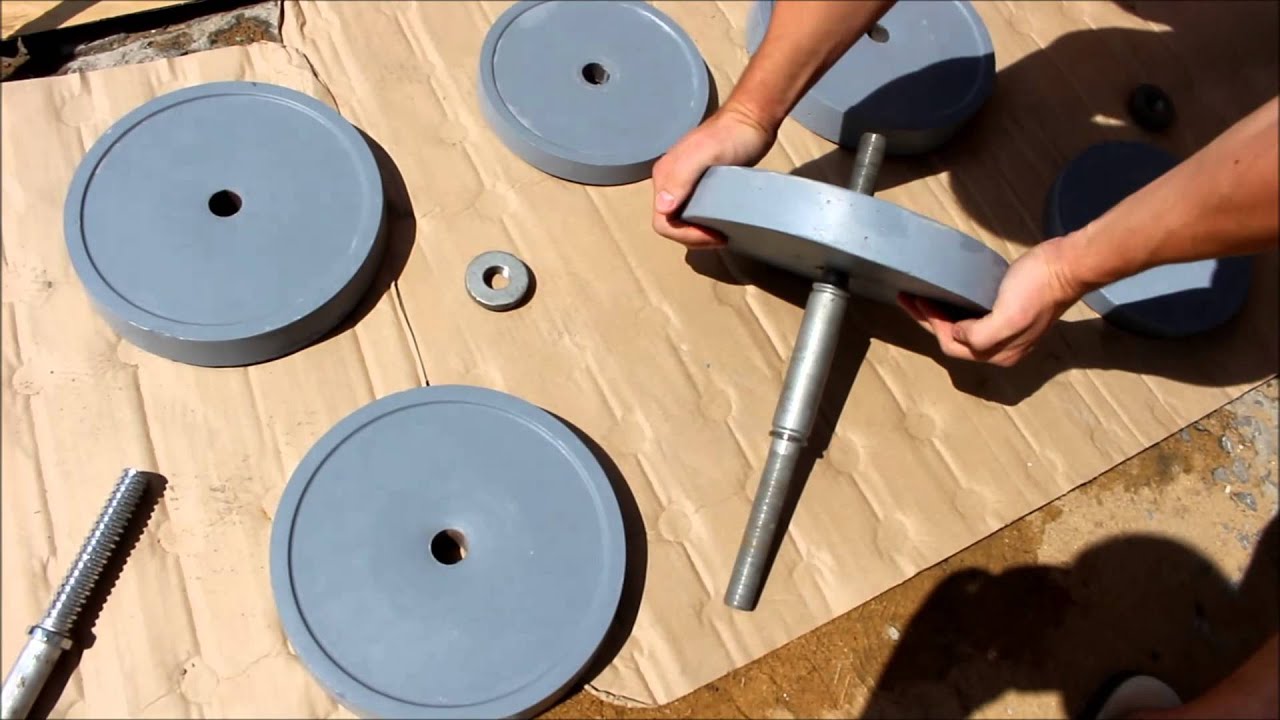 Цементная основа позволяет получить более тяжелые гантели и штанги, нежели с использованием пластиковых бутылок. Блины получаются не только более внушительного веса, но и выглядят гораздо солиднее. Они отливаются из цементного раствора в специальной форме, внутри которой находится гриф. Минусом такой конструкции является то, что нагрузку снаряда невозможно регулировать либо подстраивать под кого-либо другого.
