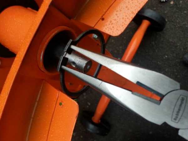 После этого приступаем к фиксированию второго стопорного кольца. Крепится оно на противоположной стороне (со стороны двигателя). Здесь без тонких плоскогубцев вам точно не обойтись. Хорошо, что я за несколько дней до этого на всякий случай их себе купил. Надев кольцо на окончание плоскогубцев, разводим их и фиксируем кольцо. Это предотвращает несанкционированное отсоединение колыбели от рамы, когда бетономешалка будет с раствором.