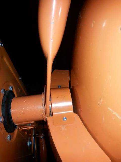Внутрь барабана помещаем лопасти (поз. 10). Снаружи, через отверстия в смесительном барабане и стойках лопасти, вставляем болты и устанавливаем шайбы, заворачиваем гайки. Просим Вас обратить внимание на то, что вершина центрального изгиба лопасти должна быть направлена в противоположную сторону направлению вращения смесительного барабана во время работы. Барабан смесительный при работе вращается против часовой стрелки, если смотреть на него со стороны загрузочного отверстия.