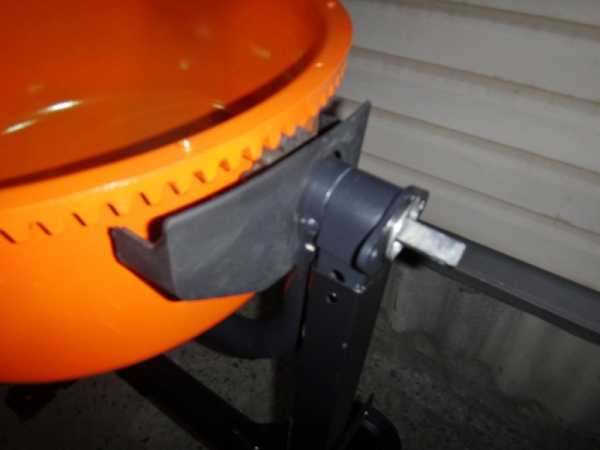 Даже если у вас не нашлось подходящего двигателя, замешивание бетона ручной бетономешалкой намного легче и производительнее, чем при помощи лопаты. Для того чтобы привести в действие бочку, на ее дно надо прикрепить диск с зубьями на внешней стороне, подойдет маховик от автомобиля. Таким же образом к раме крепится редуктор.