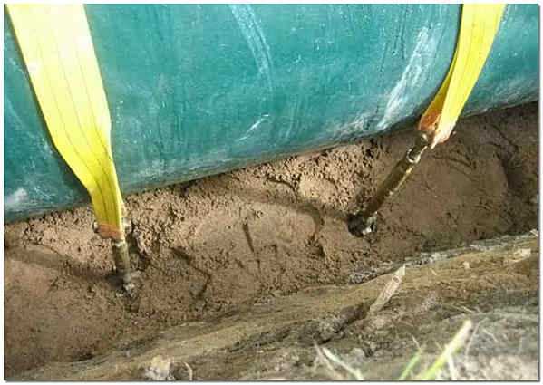 - Конструктивное исполнение. Чтобы септик при высоком УГВ не всплывал, его надежно закрепляют хомутами или стяжками. В этом плане удобнее конструкция, в которой уже имеются петли или проушины для фиксации.