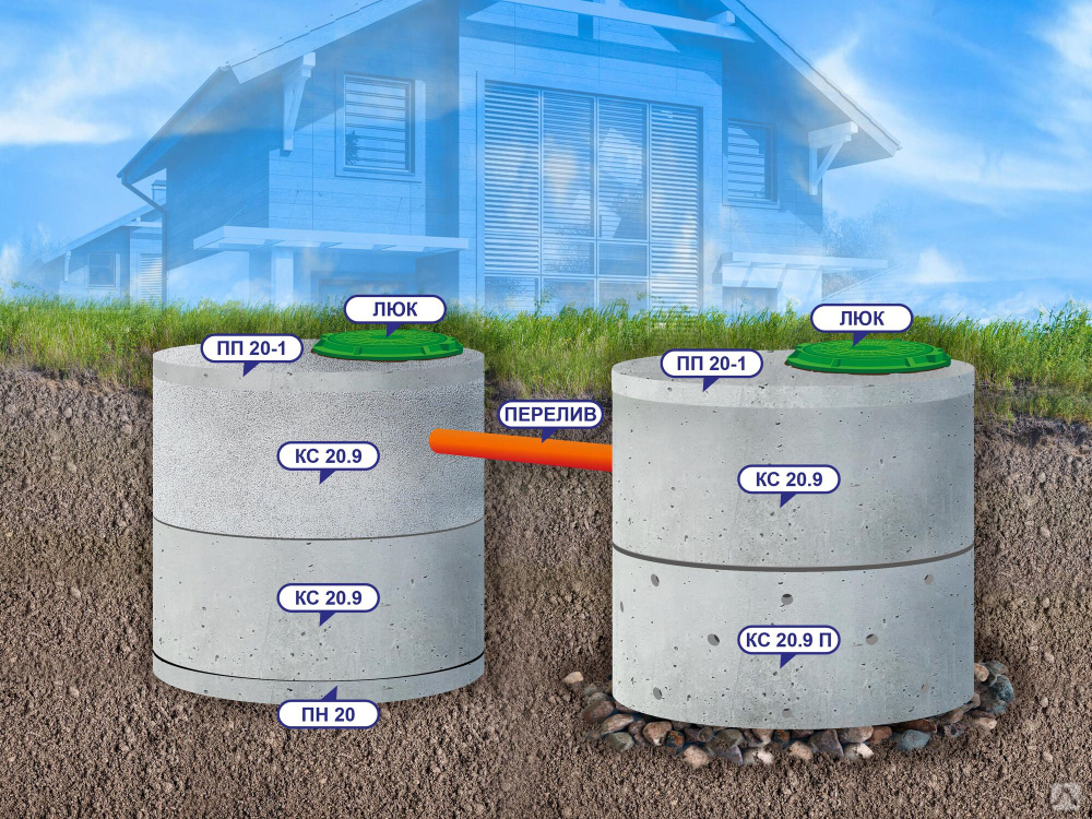 В частной практике чаще всего используется бетонные кольца, бетон, кирпич и еврокуб (пластмассовые ёмкости больших объемов). Конфигурацию выбирают однокамерную, она легче в строительстве и эксплуатации.