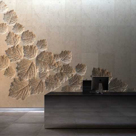 Поверхность с рельефным рисунком гармонично сочетается с различными материалами, а также предметами интерьера: