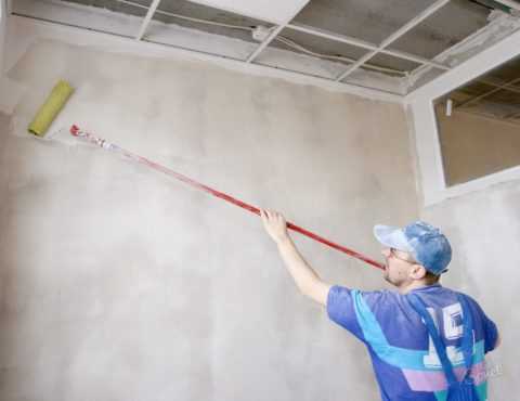 Грунтовка стен необходима для улучшения сцепления штукатурки с бетоном.
