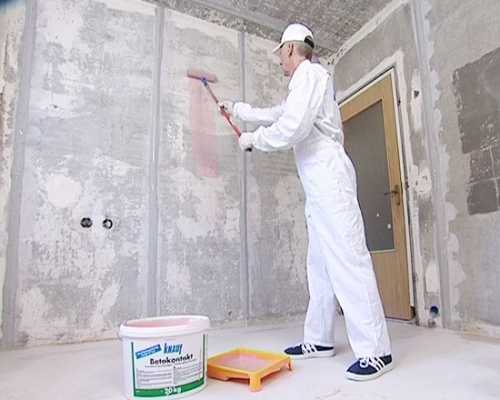 Для монолитных бетонных стен, имеющих плотную структуру, обычно используется грунтовка на минеральной основе, в которой вяжущим веществом служит цемент. Специалисты рекомендуют использовать и грунтовку, которая называется бетоноконтактом. Этот материал способен стабилизировать стены из бетона под нанесение гипсовой и других штукатурок.