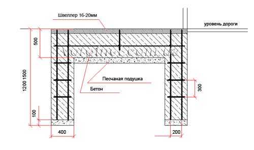 - Таким образом, получившийся закладной элемент помещается арматурой вниз. При укладке проследите за тем, чтобы боковая часть швеллера прилегала к столбу опоры забора. Также швеллер необходимо выставить строго по уровню и ровно параллельно линии открывания ворот.