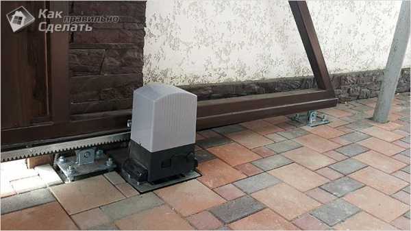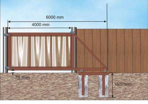 Однако этого не происходит, поскольку за пределами проема, куда створка отъезжает при открытии, у нее имеется основательная поддержка. Ее осуществляют противовес в виде массивной треугольной рамы, два основательно забетонированных опорных столба, специальный фундамент.