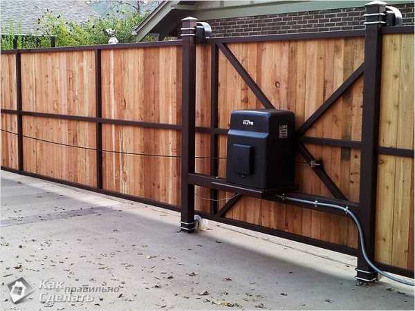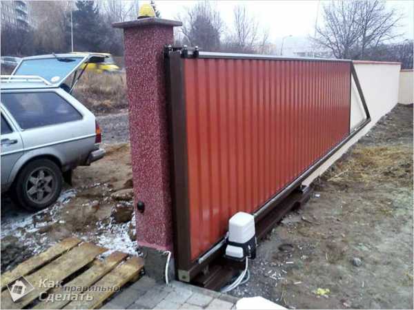 Открываются и закрываются ворота автоматически. В комплект автоматики входит зубчатая рейка, которую прикрепляют к полотну ворот. Сдвигает ее с места привод, цепляющийся свой шестерней, а ограничивают ход два концевика, установленные на рейке. Такие ворота способны работать в любых климатических условиях, годами не требуя ремонта. Разве что стирающиеся ролики приходится периодически заменять.