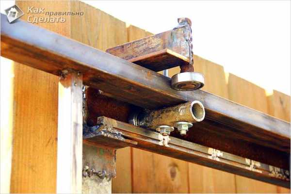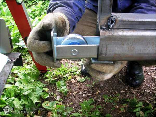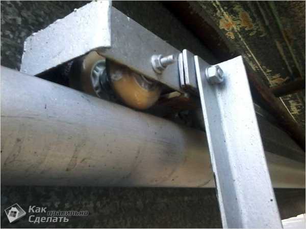 На опорные столбы со стороны ворот закрепляем вертикально трубы 60 х 60 (фальш-столбы) по высоте полотна плюс 10 см. Фальш-столб возле фундамента называется боковым и может быть выполнен в виде рамы, противоположный ему — приёмным или разгрузочным, так как он принимает и удерживает полотно между открываниями. К боковому столбу на нужной высоте прихватываем поддерживающую планку с роликами.