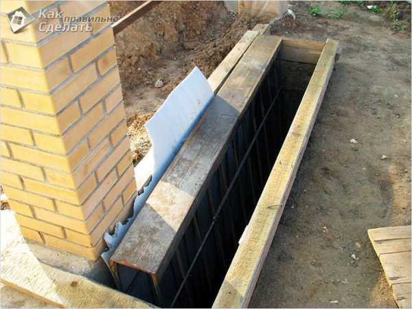 - Для изготовления закладного элемента можно использовать швеллер 16. Его длина должна соответствовать длине траншеи. В фундамент закладывается арматура Ø12 мм. Арматуру необходимо приварить к швеллеру и соединить ее поперечными связями.